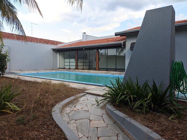 4) Casa mobiliada, 3 quartos, sendo 1 quarto com cama de casal e ar condicionado e TV, 1 quarto também com cama de casal TV, ar condicionado e ventilador,  1 quarto com cama de casal e ventilador, 1 sala social  com TV, ar condicionado e ventilador ,  1 banheiros social,  1 cozinha completa com 1 fogão, forno elétrico, forno micro-ondas, 1 geladeira, área externa contendo Quiosque com churrasqueira, geladeira, freezer, fogão e banheiro, Piscina com hidromassagem e cascata, garagem para 4 carros coberta, wi-fi, cerca elétrica ,  Permite até 12 pessoas trazendo colchões que faltarem, fácil acesso ao parque do Peão.